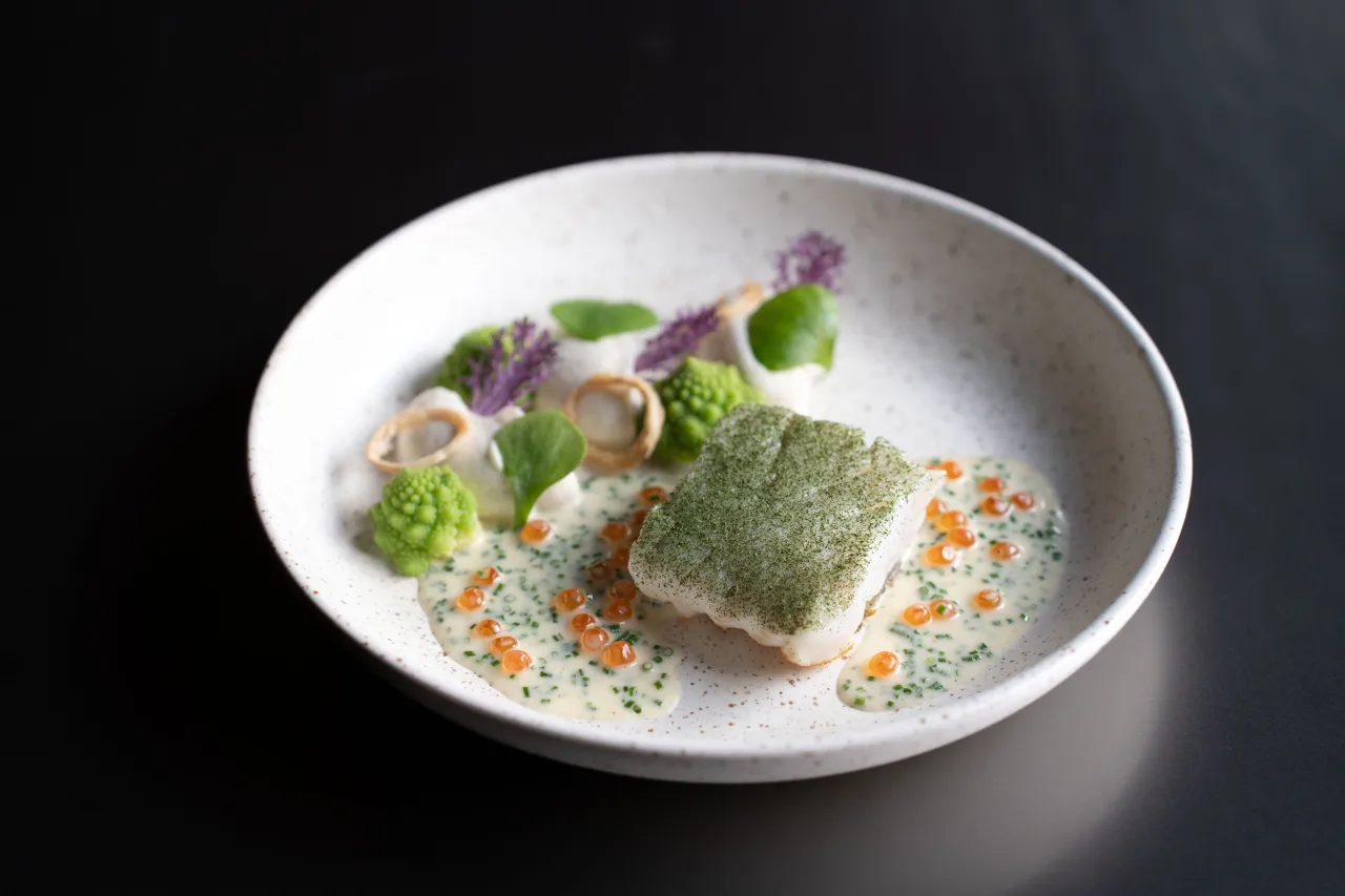 - SKREI (WINTER COD) – cured with huacatay, Mechelen cauliflower, Madagascar vanilla 42€