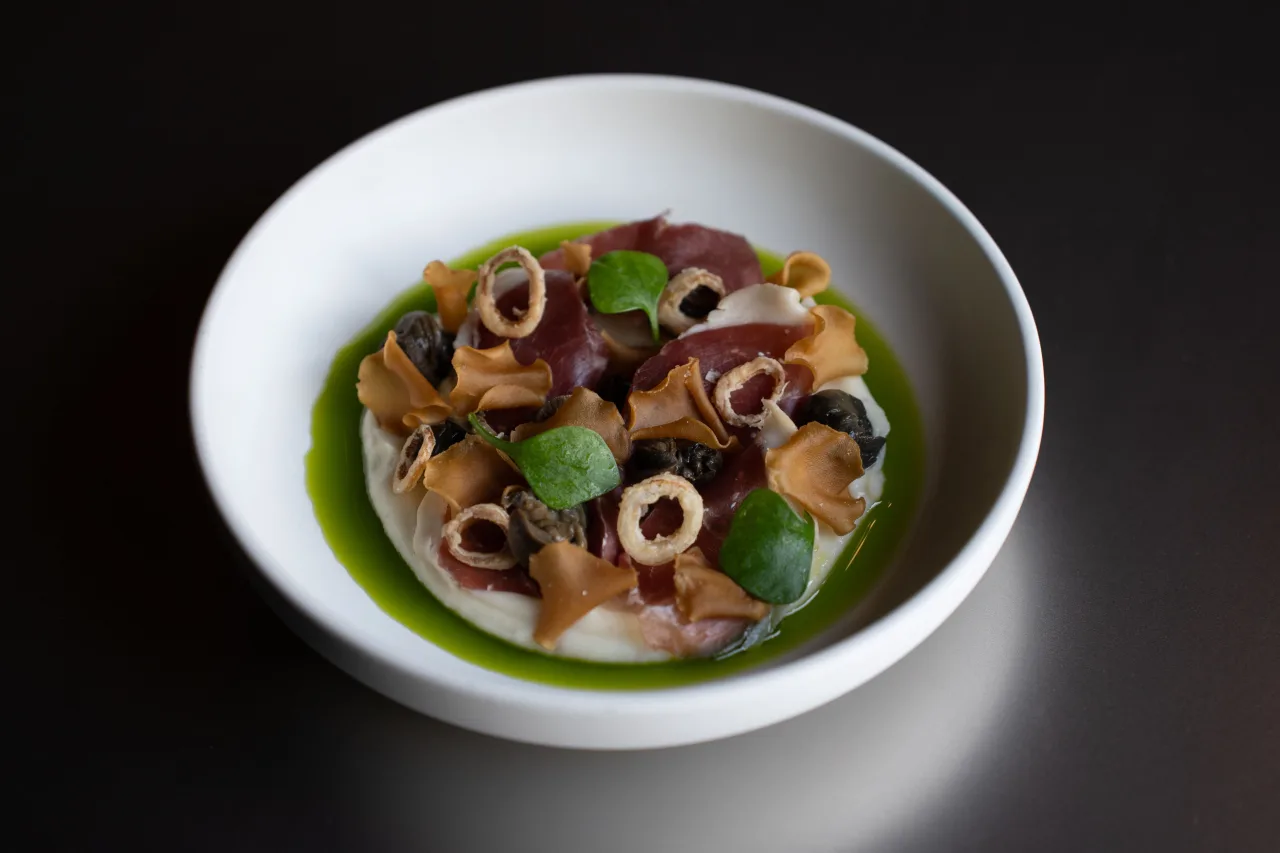 - BURGUNDY SNAILS – parsley root, Mangalica ham, lovage oil 28€